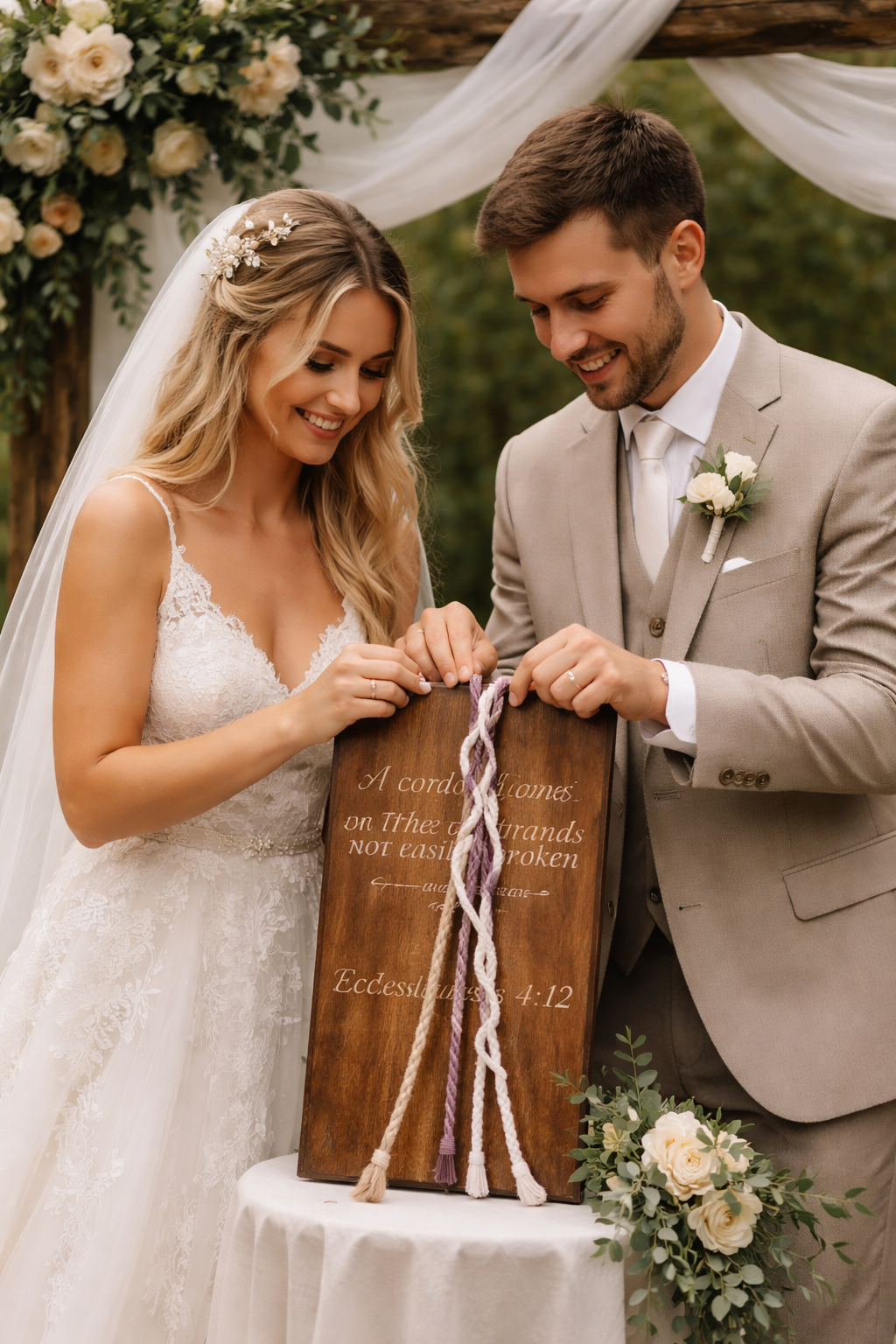 This ceremony carries the same symbol as the unity candle – the joining of separate lives and families into one. The groom will hold a metal loop with three pieces of different colored rope already knotted to the loop. The bride will braid together the three pieces of rope – one symbolizing the groom, one symbolizing the bride, and the center rope symbolizing God or their Faith. The braided ropes can be kept as a reminder of your commitment and wedding day.